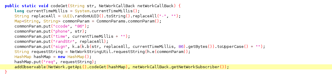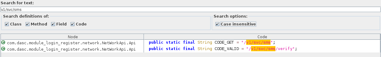 使用 jadx 打开 apk, 可以看到只是混淆了并没有加壳,搜索 v1/svc/sms 可知: