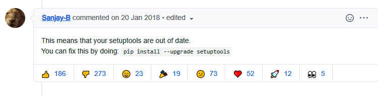 - 搜索得知执行 pip install --upgrade setuptools就可以![]()